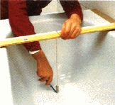 Der Monteur nimmt für den passgenauen Zuschnitt des neuen Wanneneinsatzes Maß.